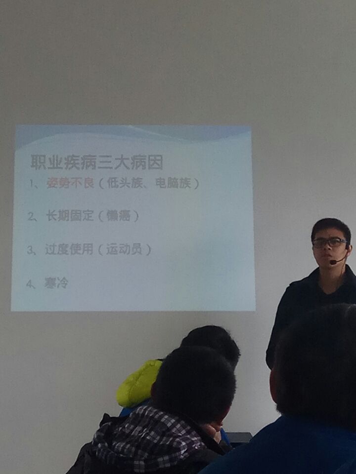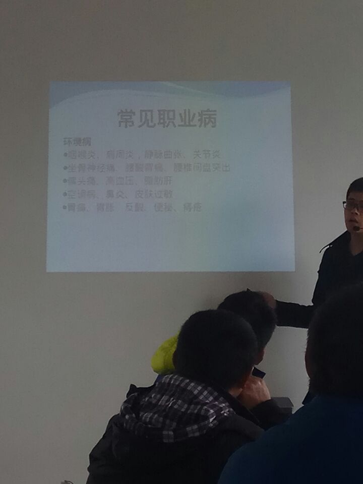 潘老師風趣幽默的講課讓培訓氣氛很愉快,員工們都聽得很認真,在培訓中學習到了不少健康知識,其中對于職業病的防治,尤其是肩部和腰部,與老師進行了很多互動。